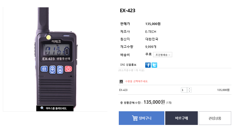 생활무전기 EX-423 (이테크) 견적서 요청 드립니다.